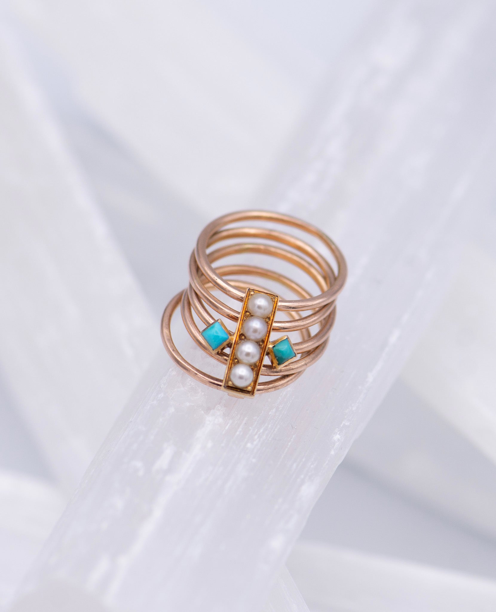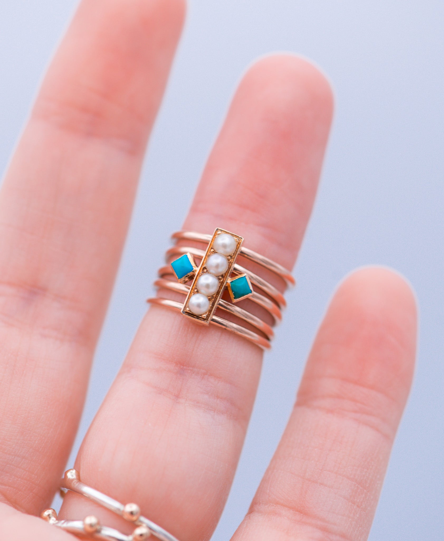 Four pearls ring; five bands ring; two turquoise ring; bluestone ring;