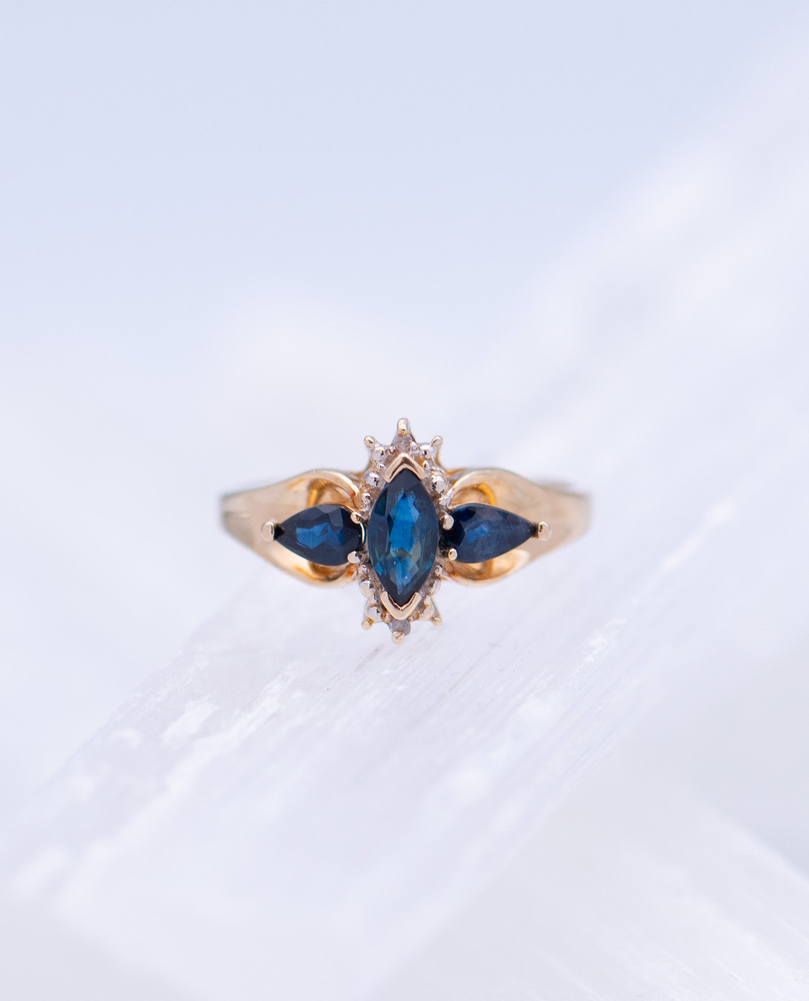 three blue stones; marquis stone; dark blue stone; due drop stone;