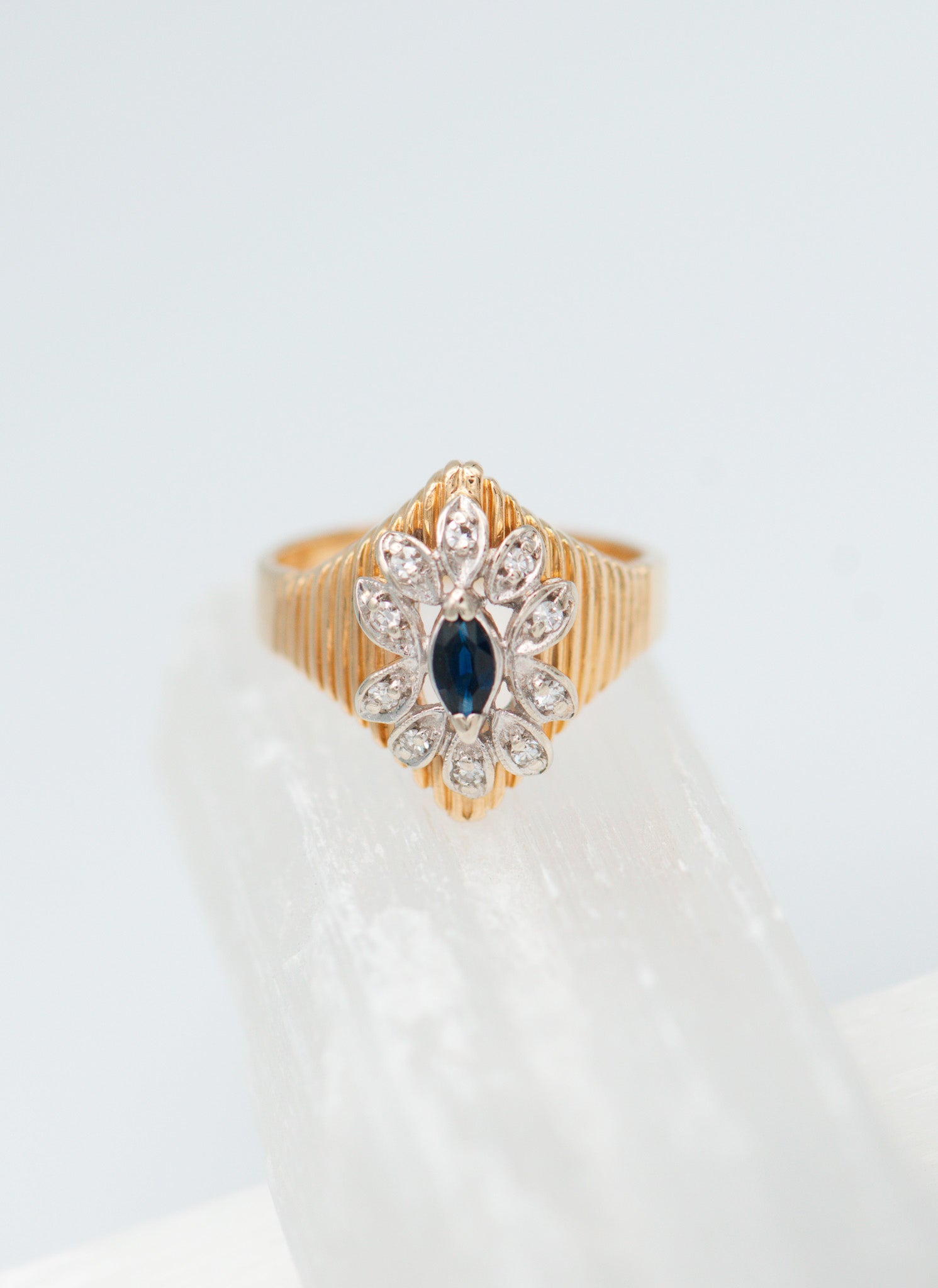 Flower crown ring; blue stone; diamond ring; crown ring;