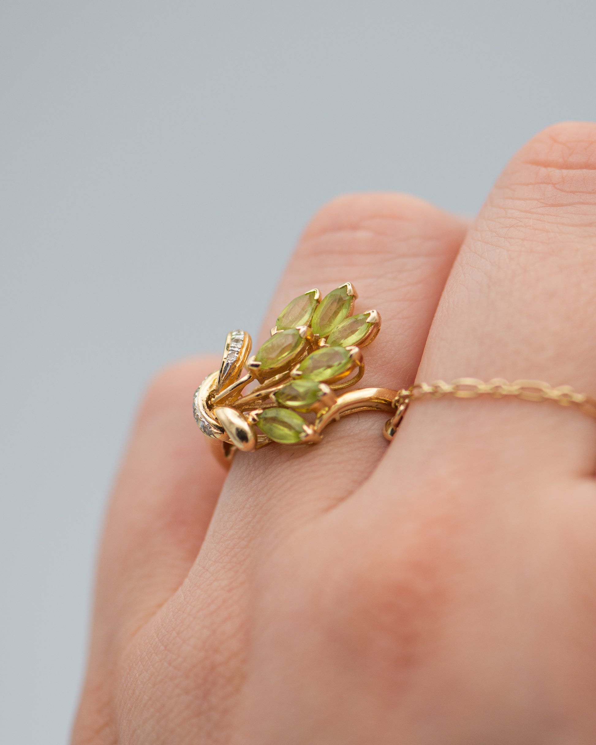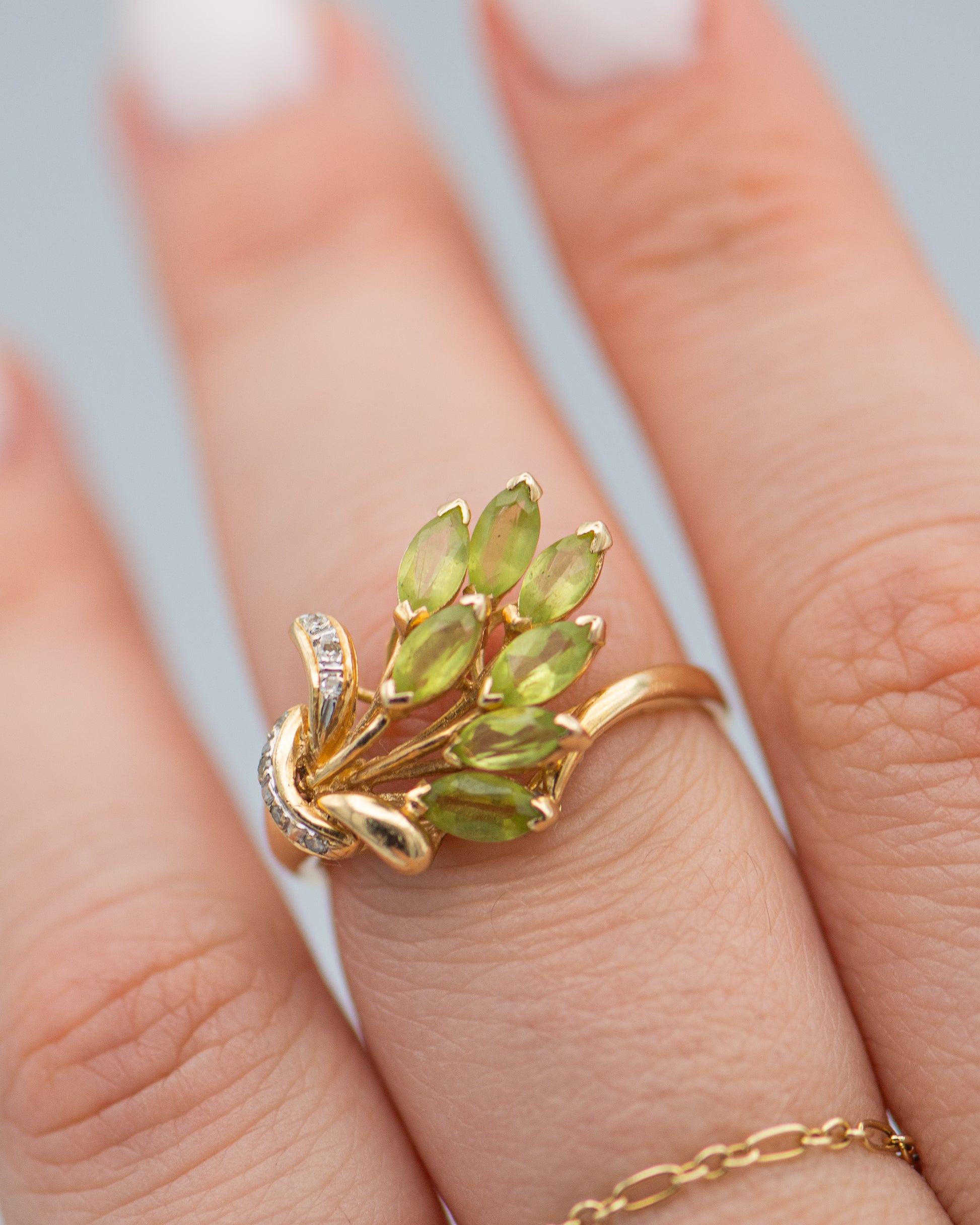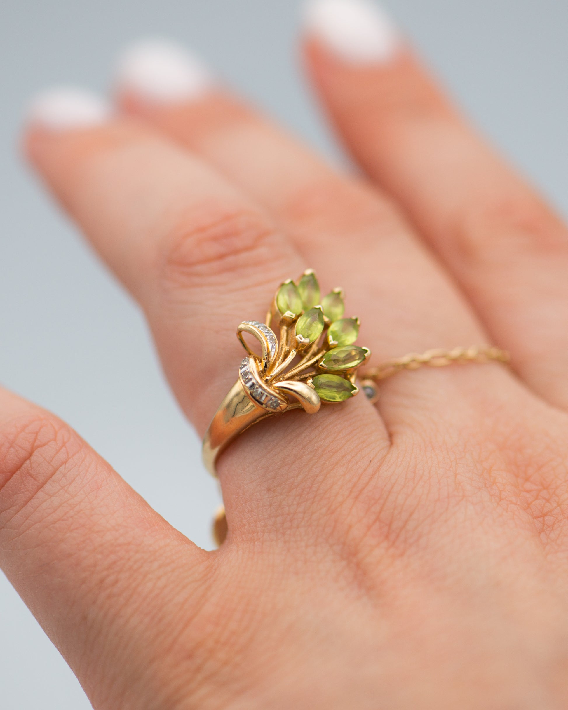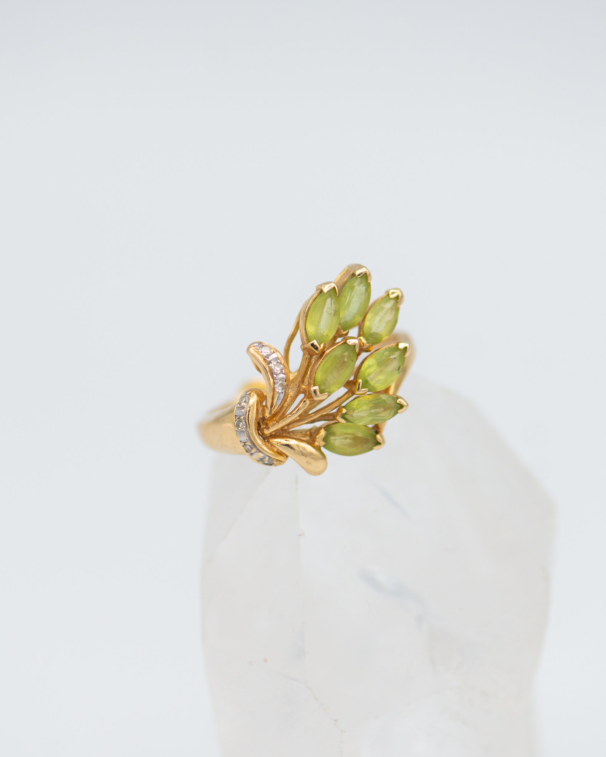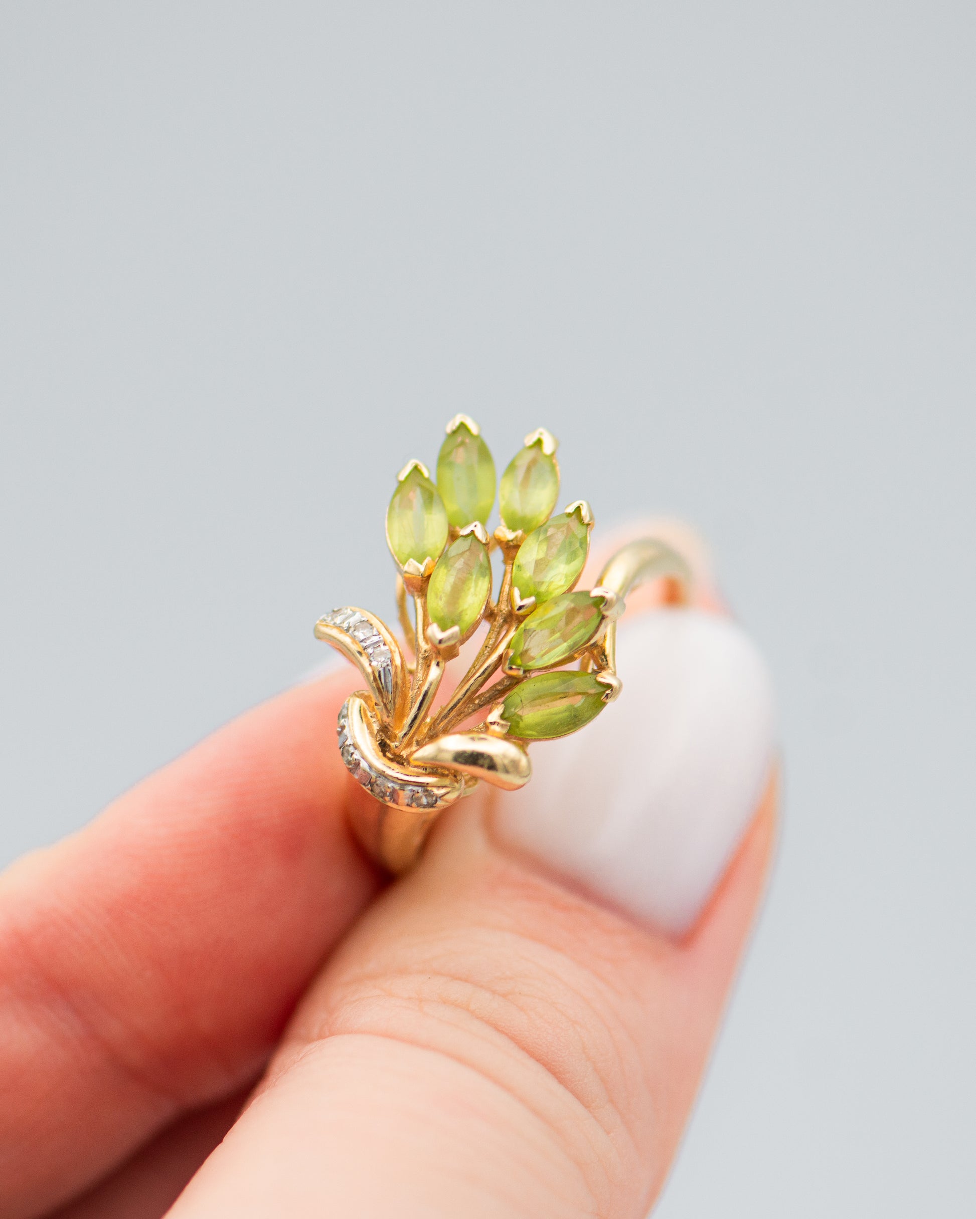 peridot bouquet ring; green stone ring;