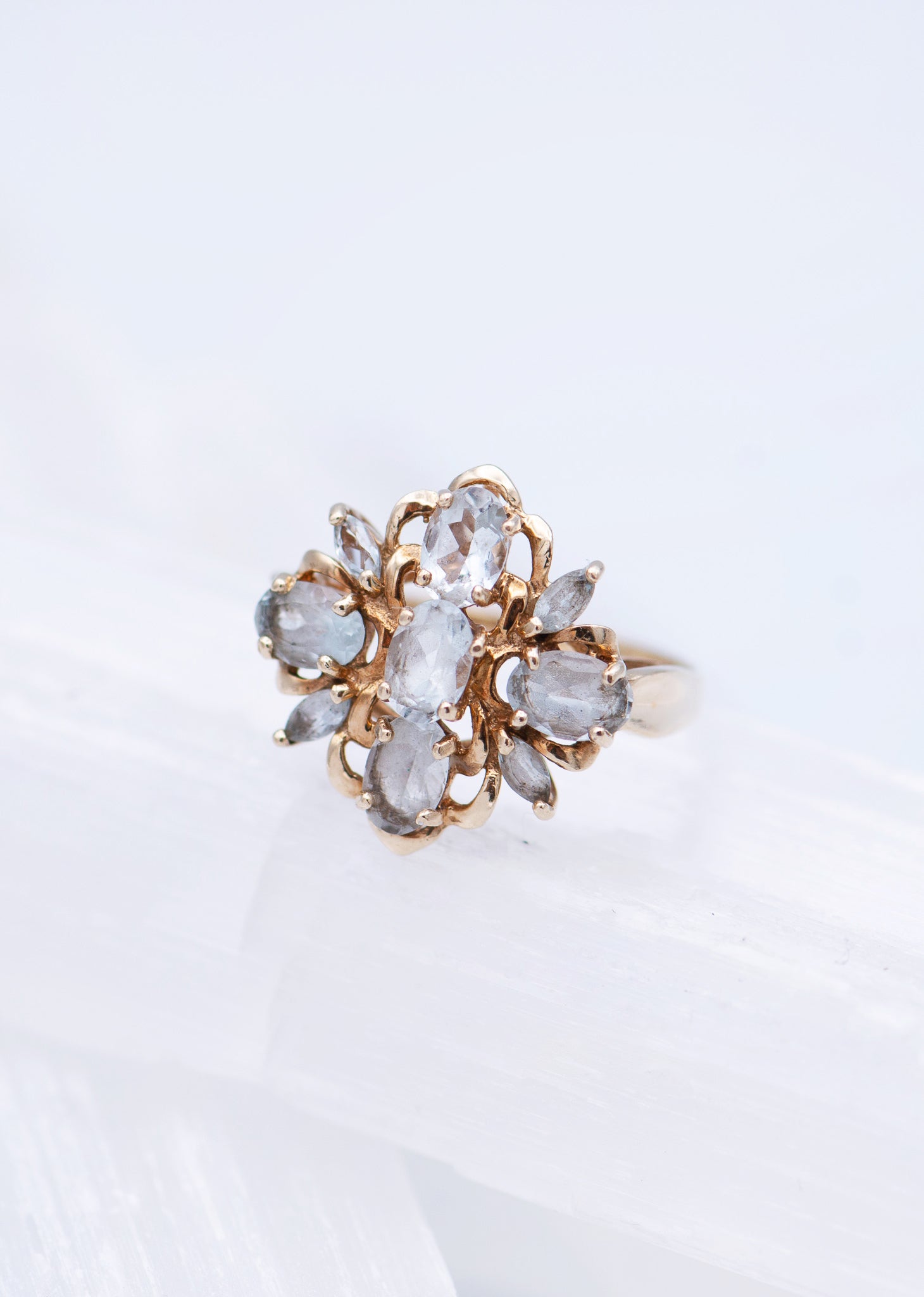 pale blue stone; gray stone; flower ring; floral ring;