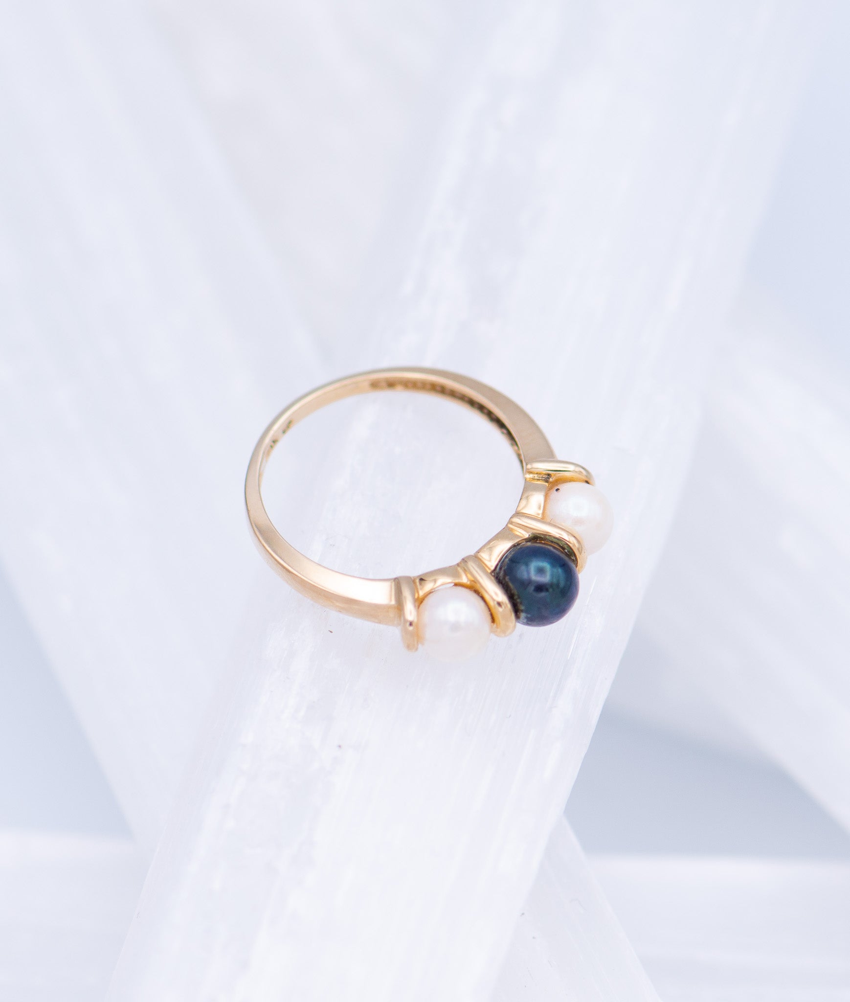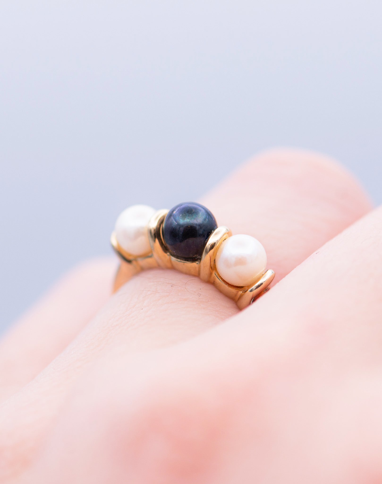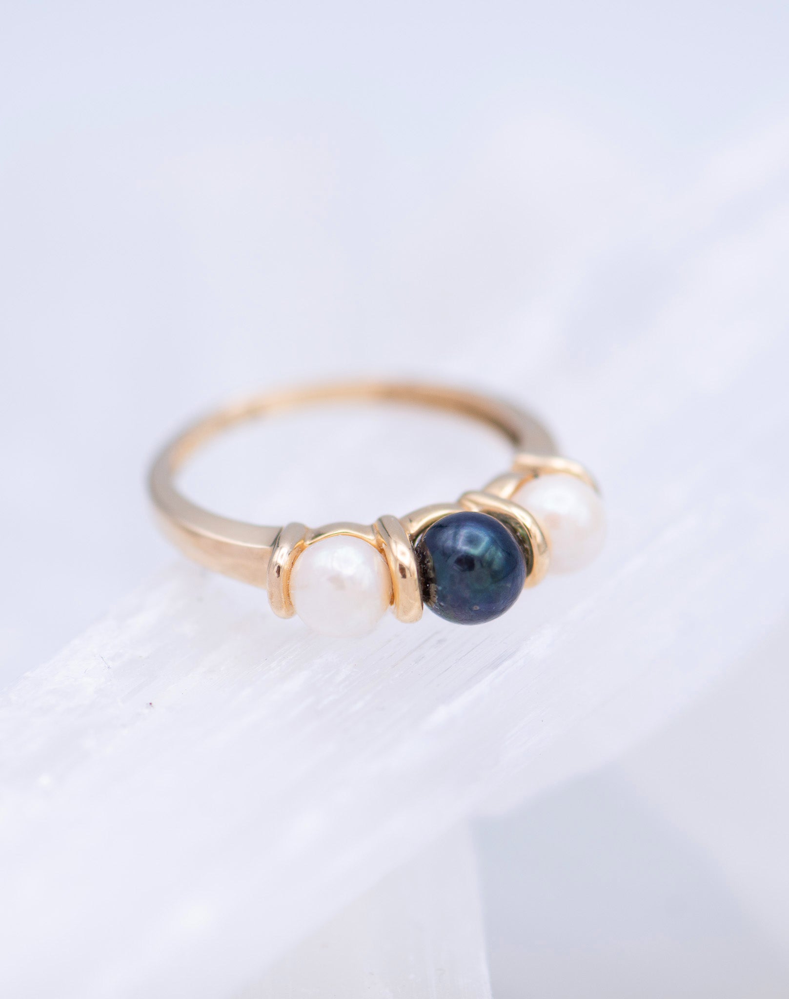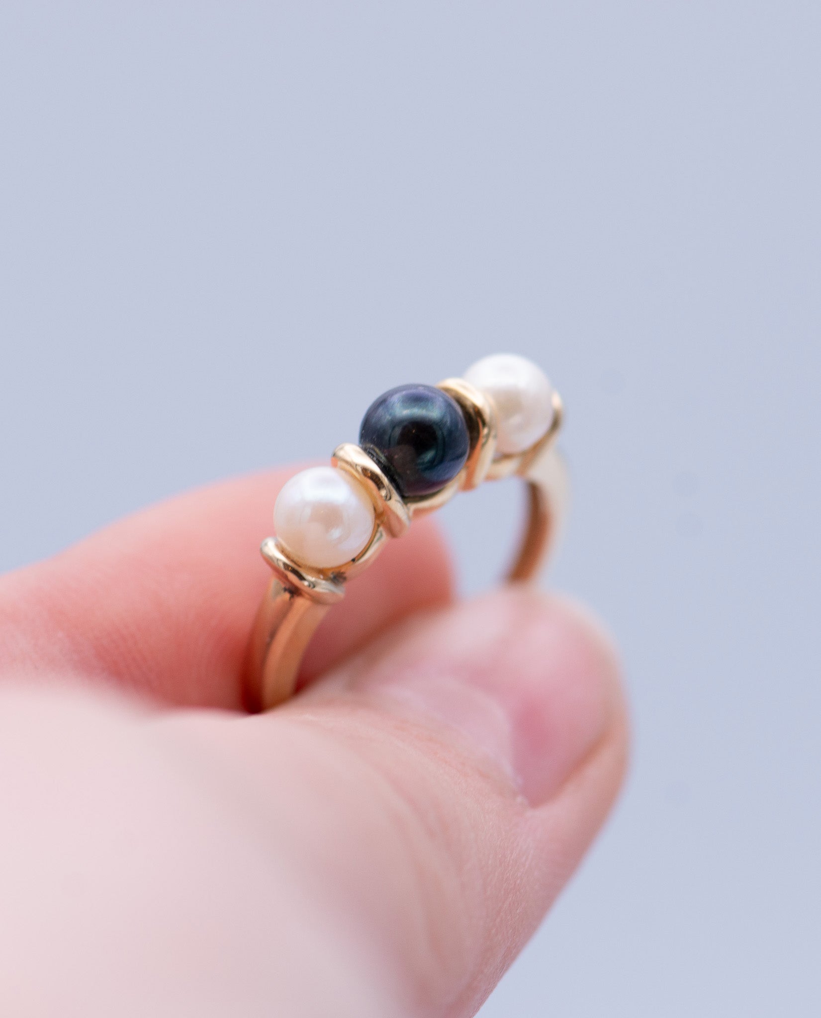 three pearls ring; two white one black pearl ring; black pearl ring;